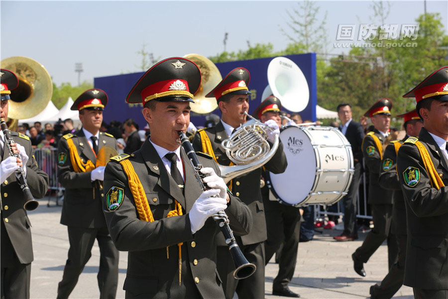 圖為烏茲別克斯坦共和國(guó)國(guó)防部中央軍樂團(tuán)在巡游現(xiàn)場(chǎng)演奏。焦國(guó)慶 攝