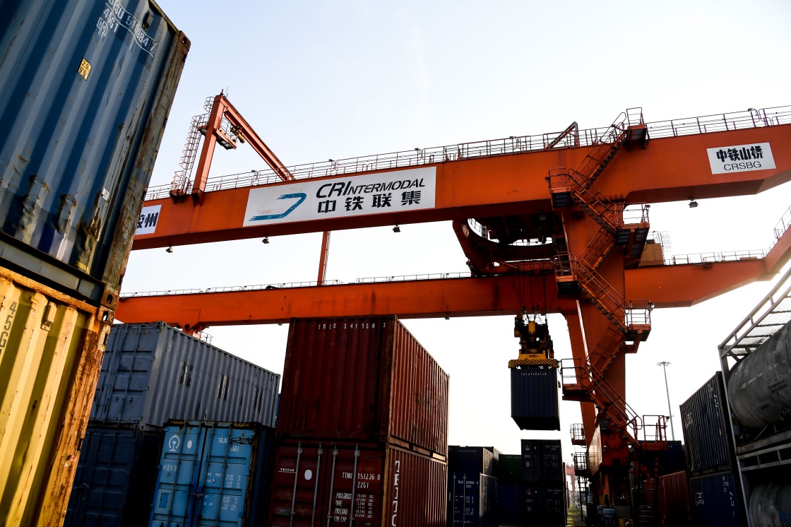 5月7日,在“中鐵聯(lián)集青島中心站”,龍門塔吊往“青島號(hào)”中亞國(guó)際班列上裝載貨物。李紫恒 攝
