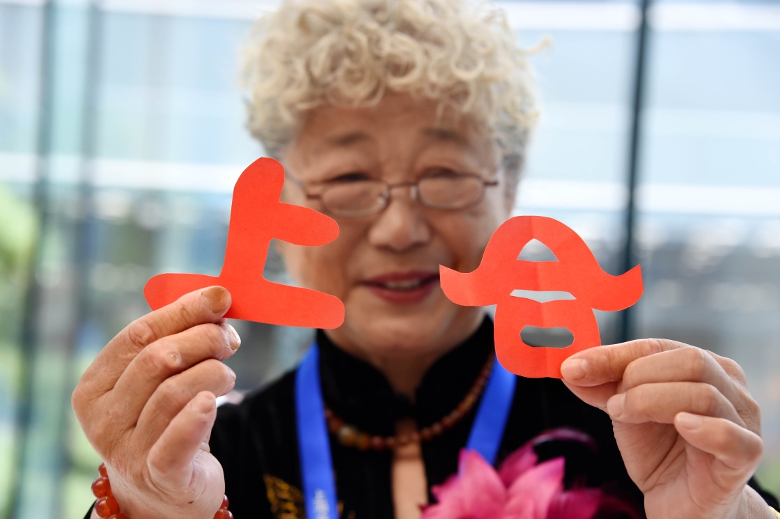 66歲的中國剪紙藝術大師李文玲在展示她剪出的“上合”。新華社記者李紫恒 攝
