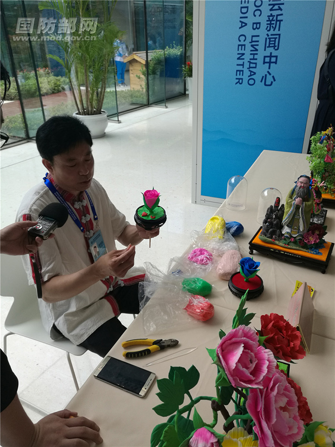 藝術(shù)家在上合青島峰會新聞中心展示剪紙、面人等中國傳統(tǒng)藝術(shù)。任旭 攝
