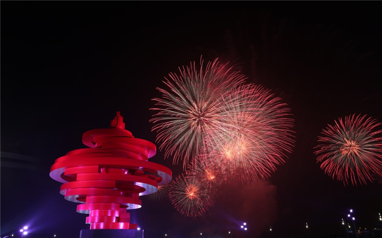 6月9日至10日,上海合作組織青島峰會在山東青島召開。這是9日晚在青島舉行的《有朋自遠方來》燈光焰火藝術表演。新華社記者 殷剛 攝