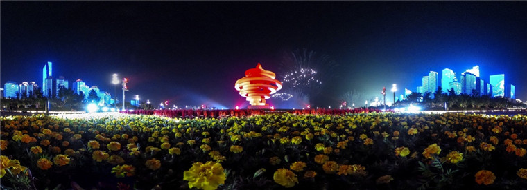 6月9日至10日,上海合作組織青島峰會在山東青島召開。這是9日晚在青島舉行的《有朋自遠方來》燈光焰火藝術表演(全景相機拍攝)。新華社記者 殷剛 攝