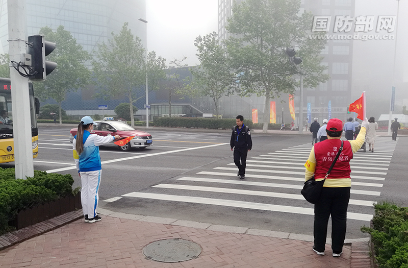 早晨的青島在薄霧籠罩中,城市志愿者在交通路口提供服務(wù)保障。青島,進(jìn)入“上合時(shí)間”,青島人民進(jìn)入“上合狀態(tài)”。任旭 攝