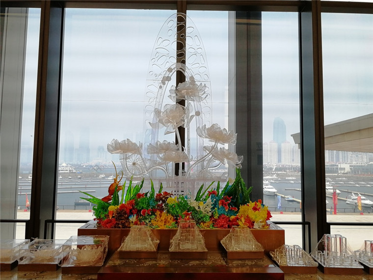 上合青島峰會主會場內(nèi)的一處裝飾(6月13日攝)。 新華社記者 蘇萬明 攝