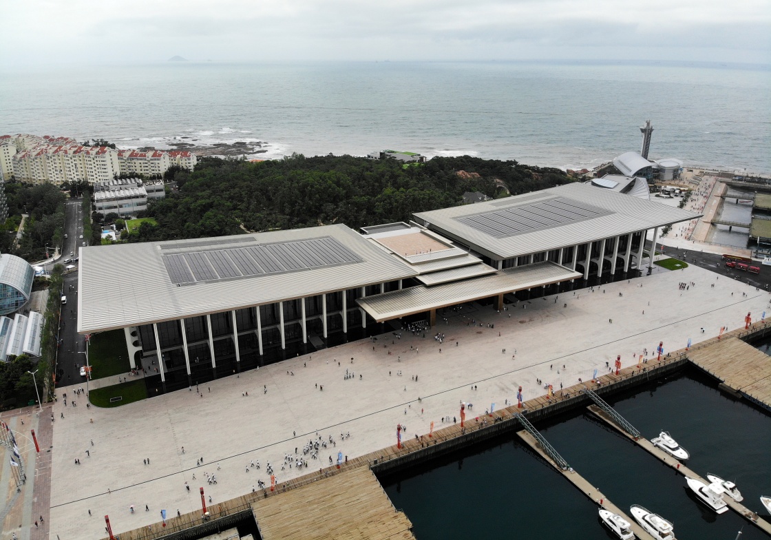 這是7月1日無人機(jī)拍攝的開放后的青島奧帆中心內(nèi)的峰會(huì)主會(huì)場——青島國際會(huì)議中心。李紫恒 攝