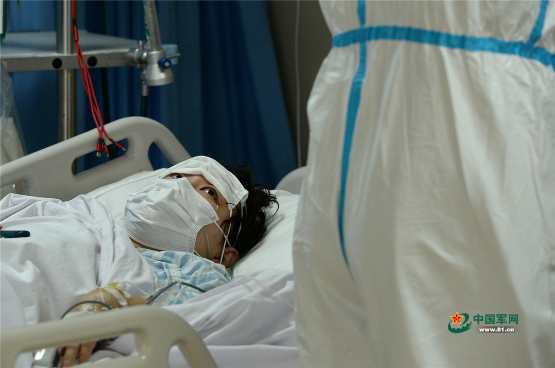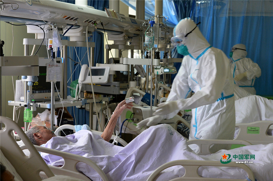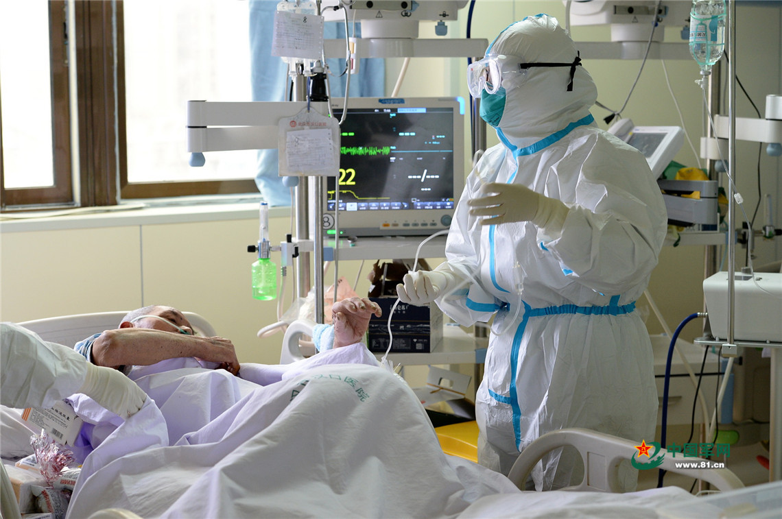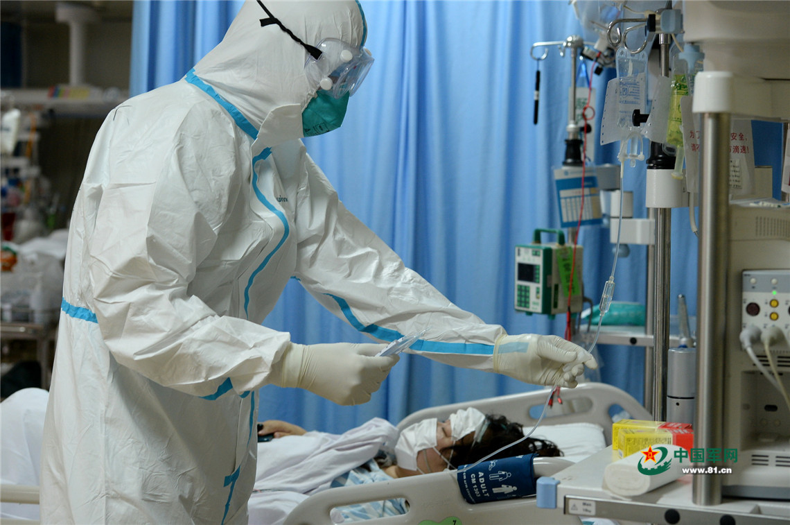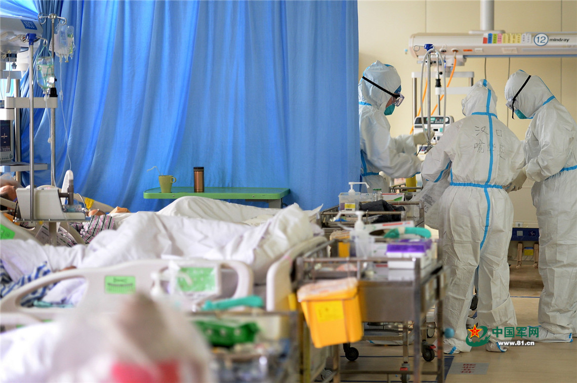 1月27日上午,海軍軍醫(yī)大學(xué)醫(yī)療隊醫(yī)護人員在武漢漢口醫(yī)院重癥監(jiān)護室對新型冠狀病毒感染的肺炎患者進行救治。在患者眼中,醫(yī)護人員就是他們的“救星”。中國軍網(wǎng)記者 范顯海 攝