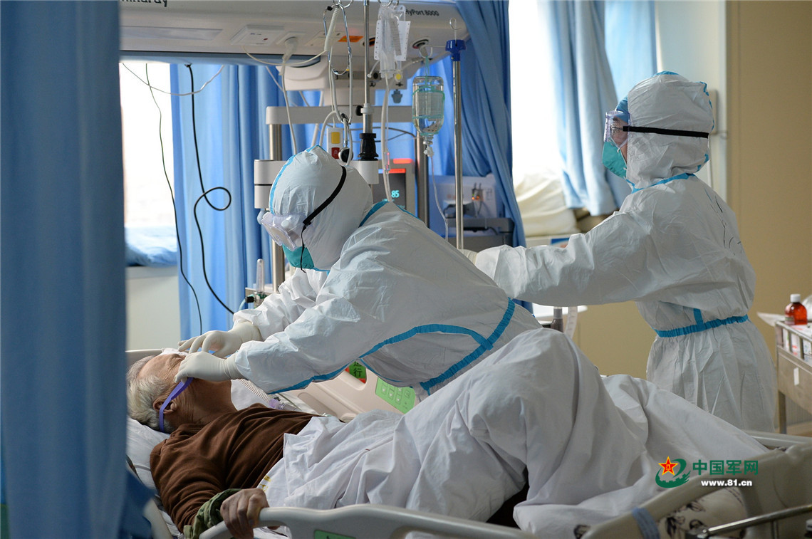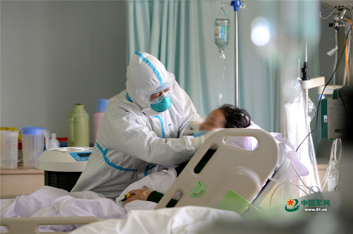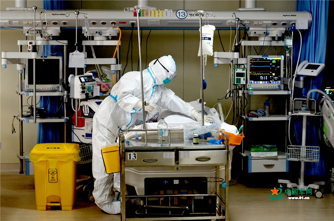 1月27日上午,海軍軍醫(yī)大學(xué)醫(yī)療隊醫(yī)護人員在武漢漢口醫(yī)院重癥監(jiān)護室對新型冠狀病毒感染的肺炎患者進行救治。這是醫(yī)護人員精心護理患者。中國軍網(wǎng)記者范顯海 攝