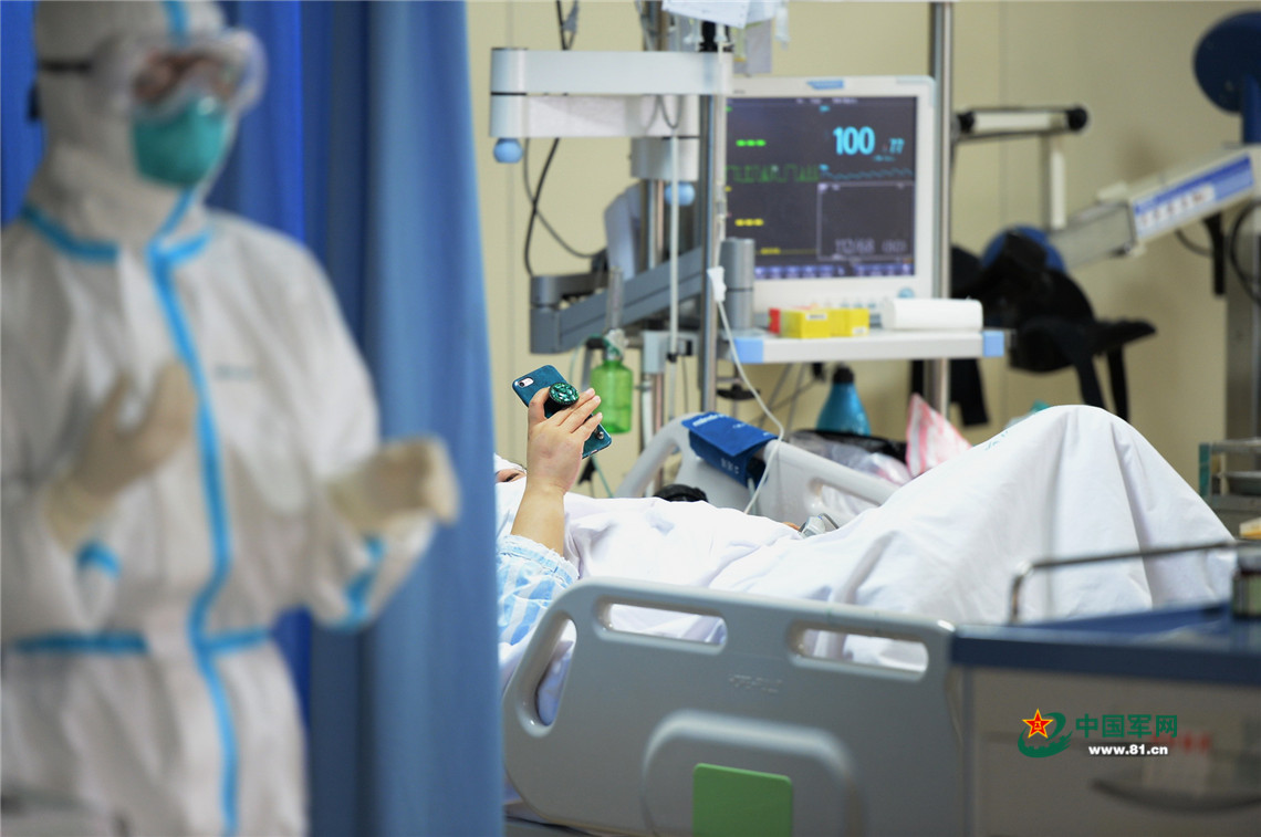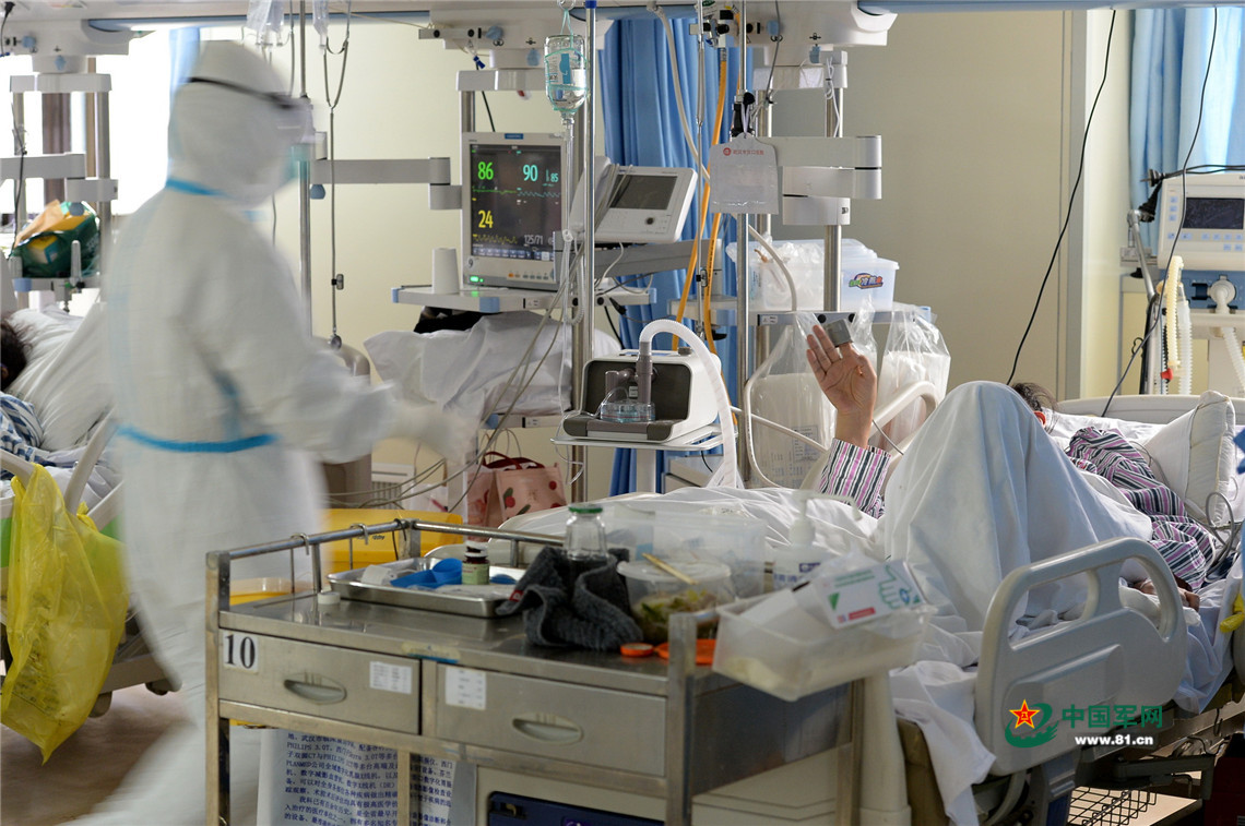 1月27日上午,海軍軍醫(yī)大學(xué)醫(yī)療隊醫(yī)護人員在武漢漢口醫(yī)院重癥監(jiān)護室對新型冠狀病毒感染的肺炎患者進行救治。這是患者在重癥監(jiān)護室得到妥善救治。中國軍網(wǎng)記者 范顯海 攝