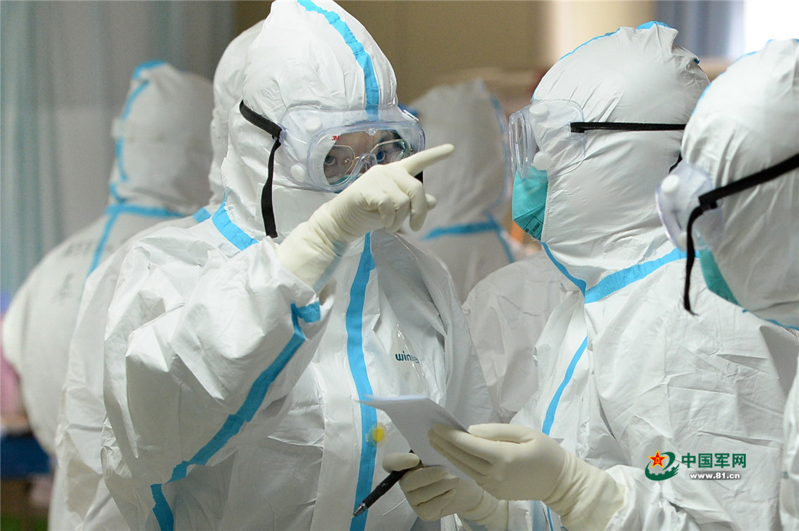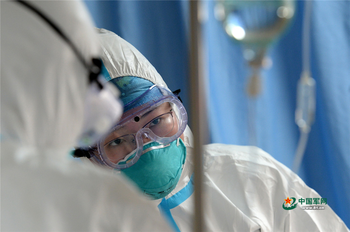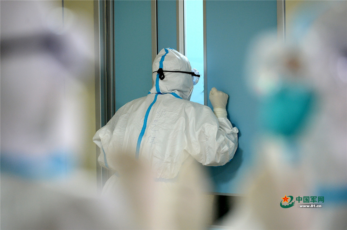 1月27日上午,海軍軍醫(yī)大學(xué)醫(yī)療隊醫(yī)護人員在武漢漢口醫(yī)院重癥監(jiān)護室對新型冠狀病毒感染的肺炎患者進行救治。這是醫(yī)護人員與監(jiān)護室外人員隔門交流。中國軍網(wǎng)記者 范顯海 攝