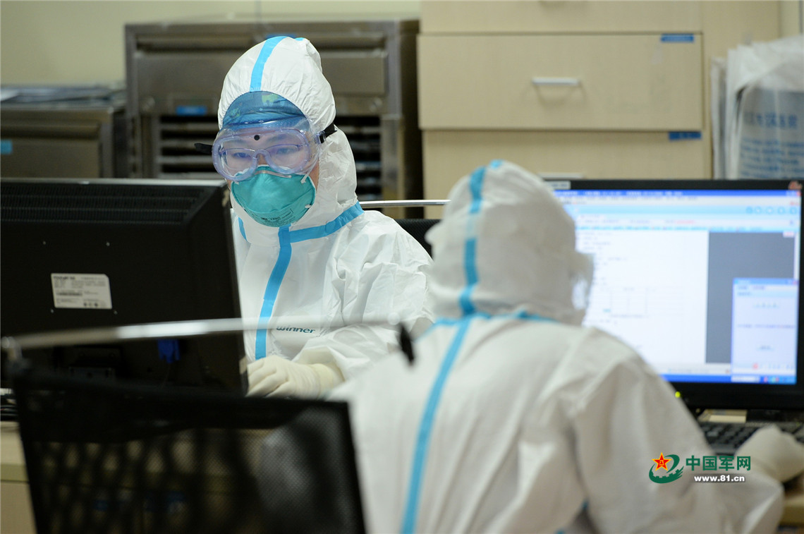 1月27日上午,海軍軍醫(yī)大學(xué)醫(yī)療隊醫(yī)護人員在武漢漢口醫(yī)院重癥監(jiān)護室對新型冠狀病毒感染的肺炎患者進行救治。這是醫(yī)護人員認真記錄醫(yī)療文書,執(zhí)行醫(yī)囑。中國軍網(wǎng)記者 范顯海 攝