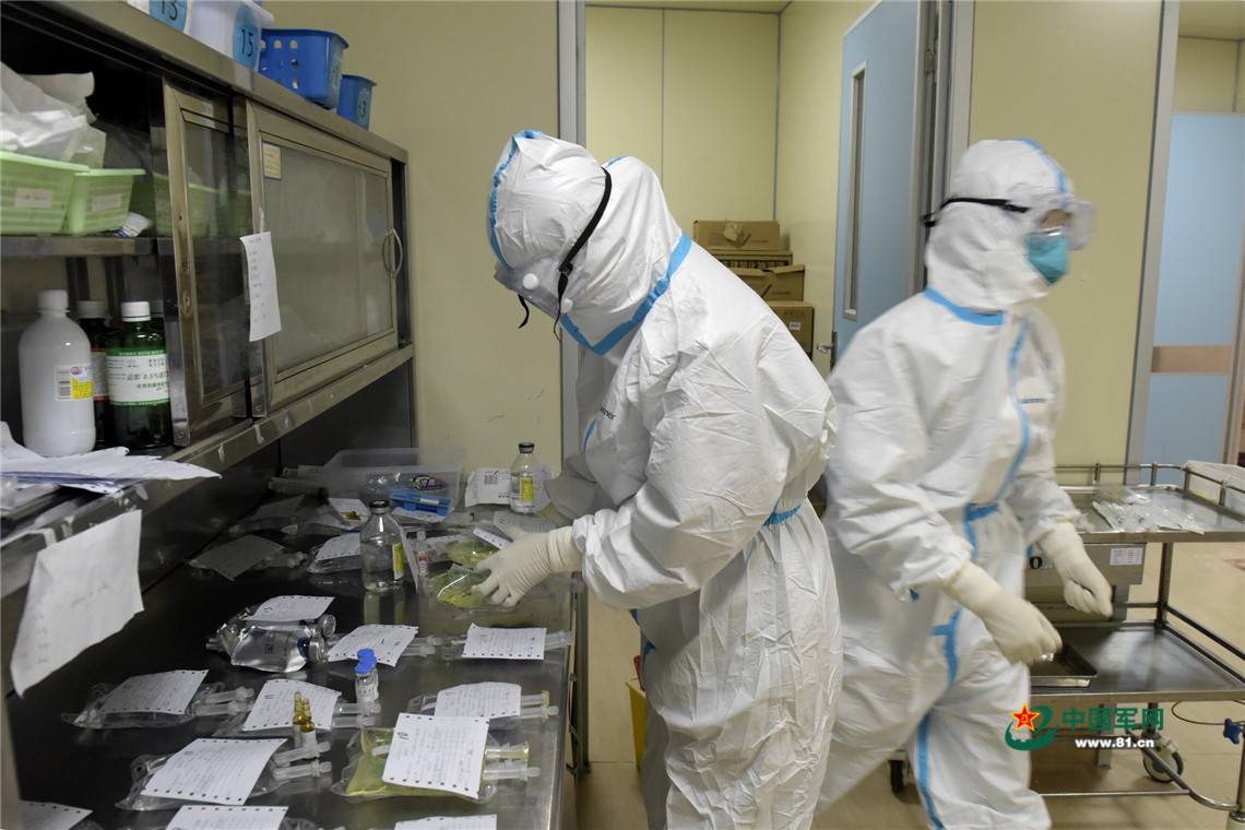 1月27日上午,海軍軍醫(yī)大學(xué)醫(yī)療隊醫(yī)護人員在武漢漢口醫(yī)院重癥監(jiān)護室對新型冠狀病毒感染的肺炎患者進行救治。這是醫(yī)護人員配備藥品。中國軍網(wǎng)記者 范顯海 攝