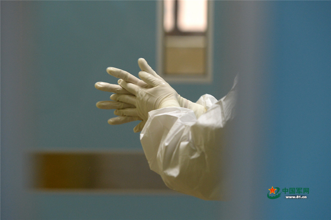 1月27日上午,海軍軍醫(yī)大學(xué)醫(yī)療隊醫(yī)護人員在武漢漢口醫(yī)院重癥監(jiān)護室對新型冠狀病毒感染的肺炎患者進行救治。這是穿好防護服的醫(yī)護人員在進入重癥監(jiān)護室前洗手消毒。中國軍網(wǎng)記者 范顯海 攝