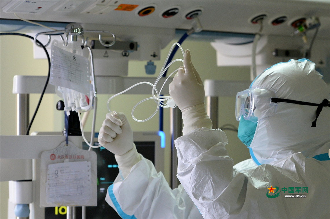 1月27日上午,海軍軍醫(yī)大學(xué)醫(yī)療隊醫(yī)護人員在武漢漢口醫(yī)院重癥監(jiān)護室對新型冠狀病毒感染的肺炎患者進行救治。這是醫(yī)護人員查看患者輸液導(dǎo)管是否通暢。中國軍網(wǎng)記者 范顯海 攝