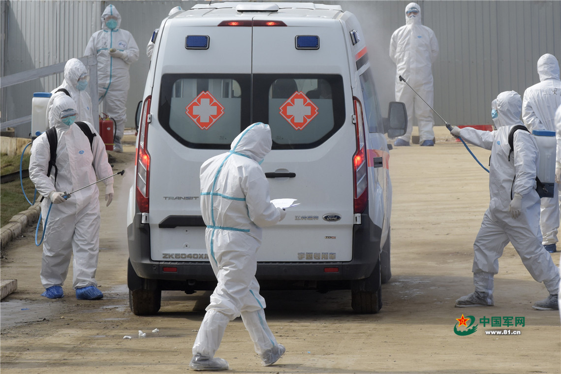 醫(yī)療隊隊員對救護車進行洗消。解放軍報記者 范顯海 攝