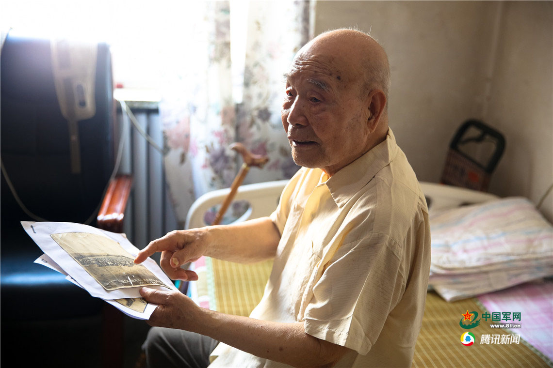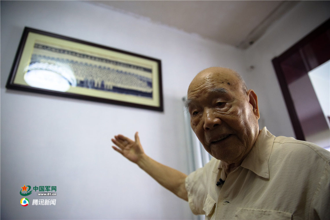 孫世友指著照片,講述1948年8月7日合影時(shí)他所在的位置。中國軍網(wǎng)記者孫智英 攝(2019年8月9日攝)