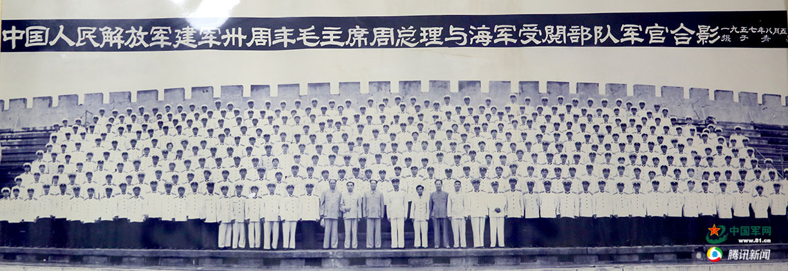 一進(jìn)門就有張小飯桌靠窗邊放著,客廳放了兩個(gè)單人沙發(fā)后也就留出一個(gè)可以走人的過道,屋里雖然不算寬敞,但干凈整潔。跟我們握手后,孫老指著沙發(fā)后面墻上掛著的照片介紹起來:這是1957年8月5日,中國人民解放軍建軍30周年,毛澤東主席、周恩來總理在青島與海軍受閱部隊(duì)軍官合影,我就站在毛主席身后。
