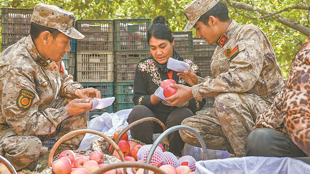 新疆阿克蘇市人武部組織民兵幫助村民采摘蘋果