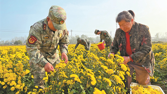 江蘇省宿遷市泗陽縣人武部組織民兵助農(nóng)采摘金絲皇菊