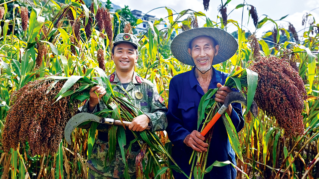 貴州仁懷市人武部組織民兵到龍井鎮(zhèn)復興村幫助村民收割高粱