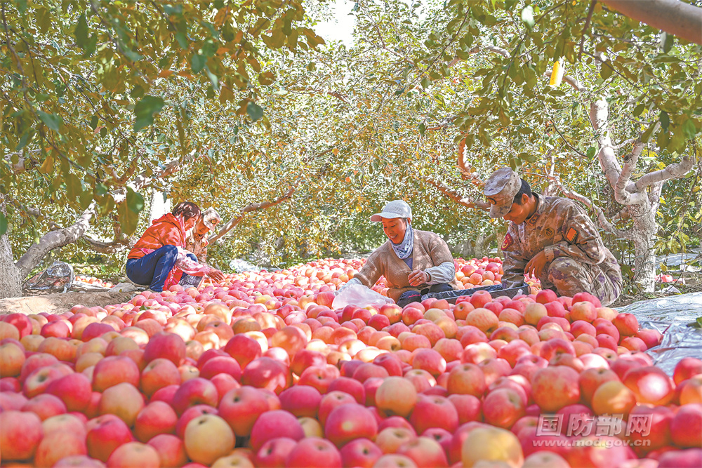 金秋時節(jié),新疆阿克蘇市蘋果喜獲豐收。連日來,該市人武部組織民兵前往幫扶村,幫助村民采摘蘋果。
