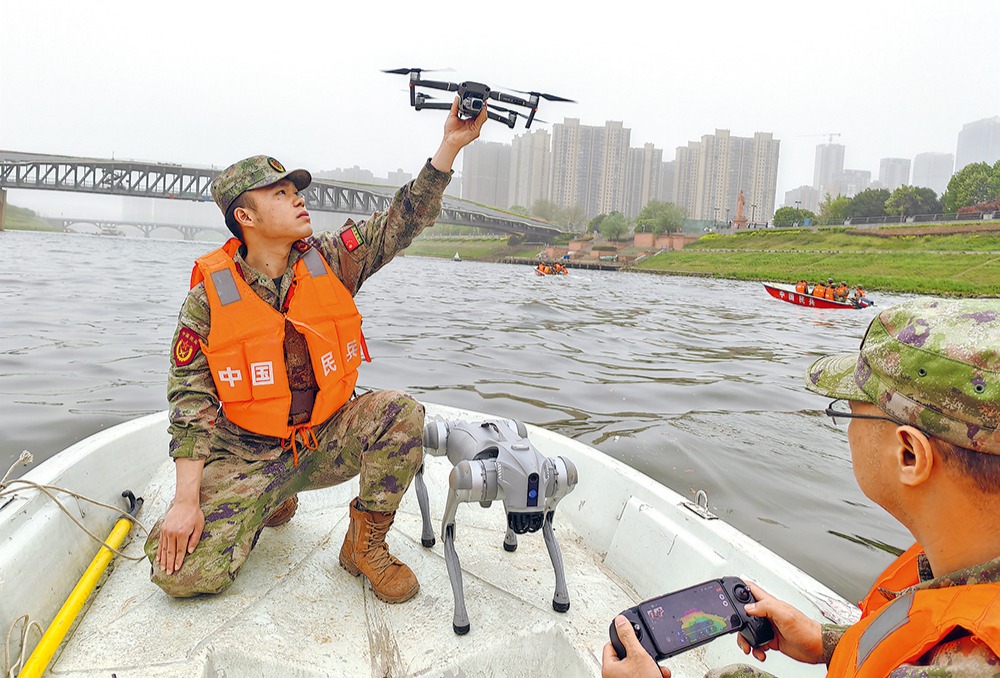 日前,湖南省長(zhǎng)沙市芙蓉區(qū)人武部組織防汛備勤民兵開(kāi)展抗洪救災(zāi)訓(xùn)練。圖為無(wú)人機(jī)操作手和機(jī)器狗操作手共同開(kāi)展應(yīng)急救援課目訓(xùn)練。曾 穎攝