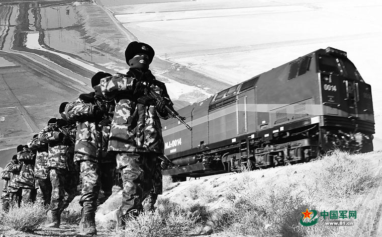 武警青??傟?duì)執(zhí)勤支隊(duì)官兵在青藏鐵路沿線巡邏執(zhí)勤。楊 浩攝
