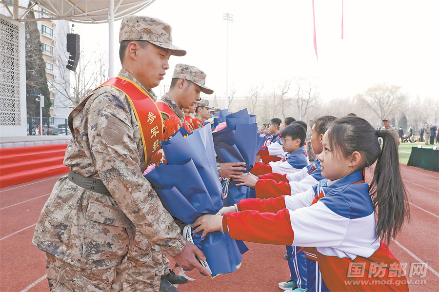 3月14日,山東省高青縣實驗中學小學部少先隊員為即將奔赴軍營的新兵獻上鮮花。孫章敏攝