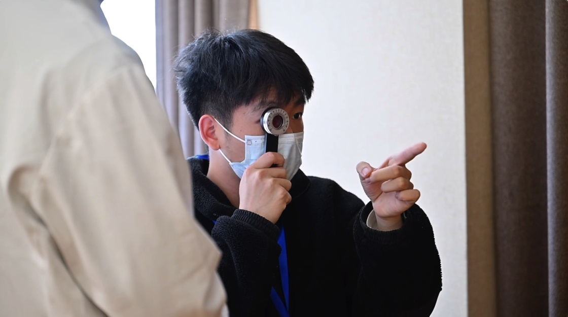 醫(yī)生為參加海軍招飛選拔的學(xué)生進行視力檢查(2023年4月2日攝,視頻截圖)。新華社記者 許楊 攝