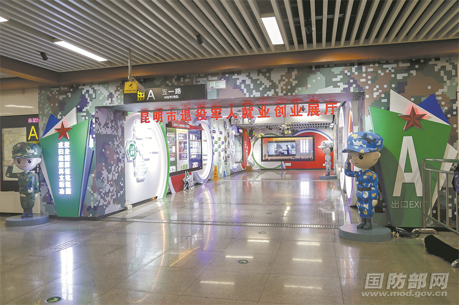 五一路地鐵站位于昆明市地鐵3號線中段,周邊商場林立,人流量大。為鼓勵和號召更多退役軍人投身就業(yè)創(chuàng)業(yè)大潮,昆明市退役軍人事務(wù)局聯(lián)合云南一家軍創(chuàng)企業(yè)在地鐵站打造退役軍人就業(yè)創(chuàng)業(yè)展廳。該廳分14個主題展板,介紹昆明市退役軍人就業(yè)創(chuàng)業(yè)園和培訓(xùn)(實(shí)習(xí))基地為退役軍人提供的就業(yè)、創(chuàng)業(yè)、培訓(xùn)服務(wù),展示退役軍人創(chuàng)業(yè)典型事跡,介紹退役軍人就業(yè)創(chuàng)業(yè)相關(guān)政策法規(guī)等。