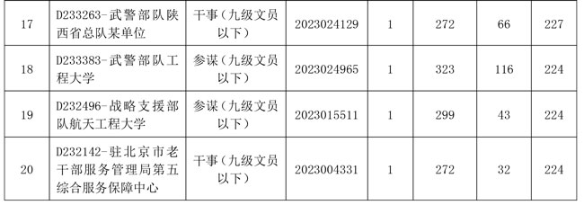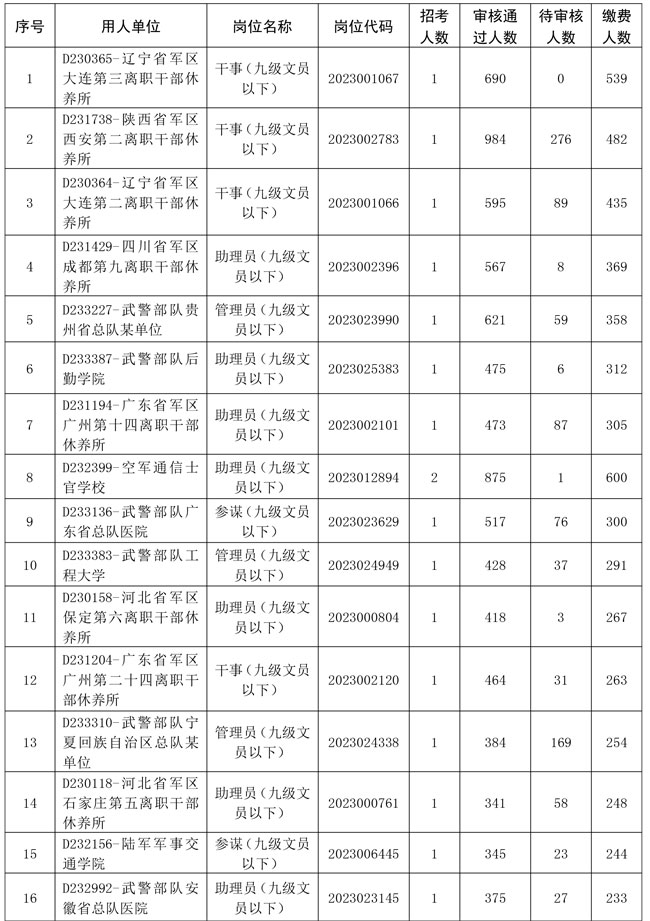 2023年軍隊(duì)文職人員公開(kāi)招考網(wǎng)上報(bào)名火熱進(jìn)行中。截至1月16日17時(shí),通過(guò)網(wǎng)上報(bào)名資格條件初審的報(bào)考人員185466名,繳費(fèi)成功的報(bào)考人員127491名,正在審核報(bào)名資格條件的報(bào)考人員88447名。有報(bào)考人員完成繳費(fèi)的崗位16914個(gè)、占50.43%,平均報(bào)招考比為7.54∶1,最高報(bào)招考比為539∶1。此次招考網(wǎng)上報(bào)名時(shí)間還剩1天,請(qǐng)廣大報(bào)考人員抓緊時(shí)間申請(qǐng)報(bào)名資格條件初審,并及時(shí)關(guān)注審核結(jié)果,通過(guò)報(bào)名資格條件初審的請(qǐng)及時(shí)繳費(fèi)和選擇考試城市。相關(guān)招考崗位報(bào)考情況如下: