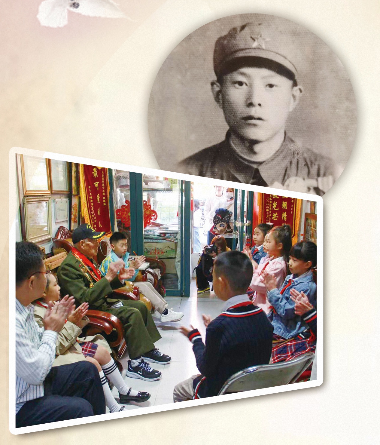 上圖:韓殿勉軍裝照。下圖:韓殿勉為小學生講述戰(zhàn)斗故事。