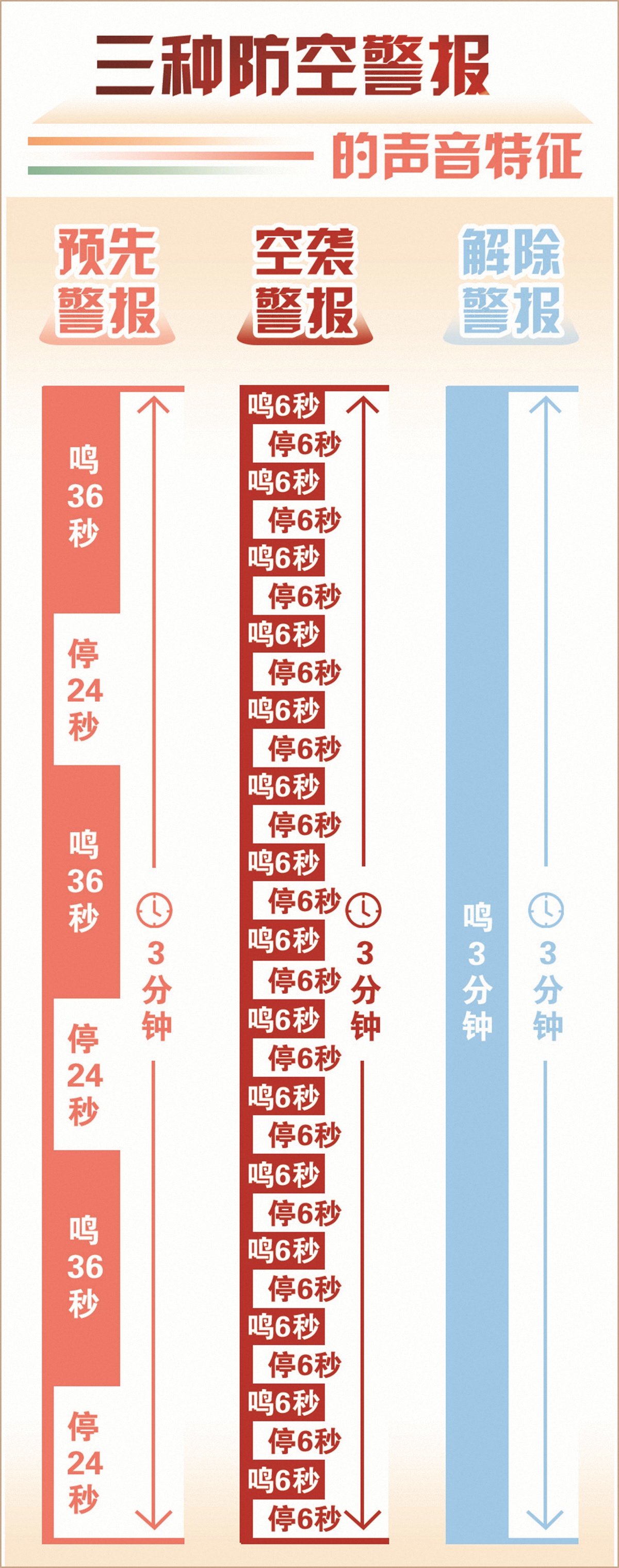 “預(yù)先警報(bào)長(zhǎng)間隔,空襲警報(bào)短間隔,解除警報(bào)無(wú)間隔……”上海市國(guó)動(dòng)辦在短視頻作品中,對(duì)三種警報(bào)聲音的特點(diǎn)進(jìn)行概括總結(jié)?!伴L(zhǎng)響長(zhǎng)停是預(yù)先,電器燃?xì)舛家P(guān);急響急停是空襲,一切活動(dòng)要停止;一聲長(zhǎng)鳴是解除,大家撤回要有序……”浙江省紹興市國(guó)動(dòng)辦把三種警報(bào)聲音特點(diǎn)和相關(guān)要求編成順口溜,讓人印象深刻。