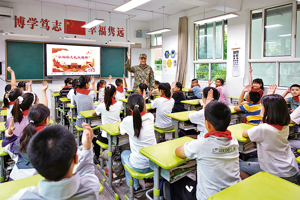 9月中旬,江蘇省鹽城市大豐區(qū)人武部開展國防教育進(jìn)校園活動。圖為該區(qū)民兵講述抗戰(zhàn)故事時(shí)與學(xué)生互動。紀(jì)毅豐攝