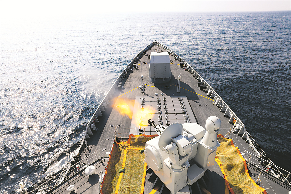 海軍第47批護(hù)航編隊(duì)近期在亞丁灣某海域開展訓(xùn)練。圖為包頭艦副炮射擊。王寧川攝
