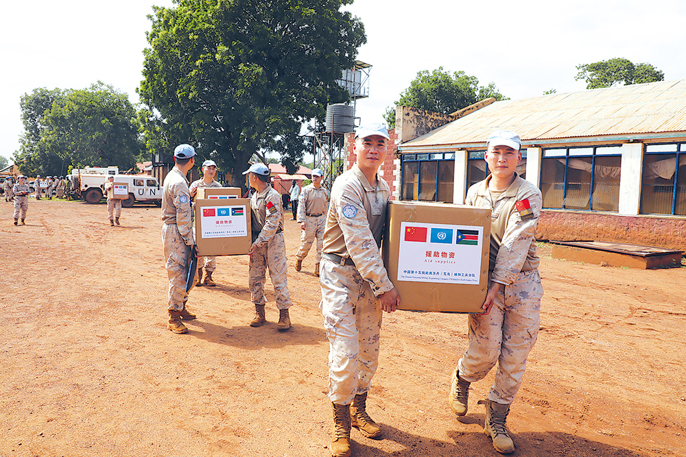 當(dāng)?shù)貢r間7月1日,中國第15批赴南蘇丹(瓦烏)維和工兵、醫(yī)療分隊官兵與聯(lián)合國工作人員等,到瓦烏教學(xué)醫(yī)院開展人道主義援助活動。維和官兵向醫(yī)院捐贈了消毒液、一次性醫(yī)用床單等醫(yī)療和生活物資。圖為維和官兵搬運(yùn)援助物資。張曉昆攝