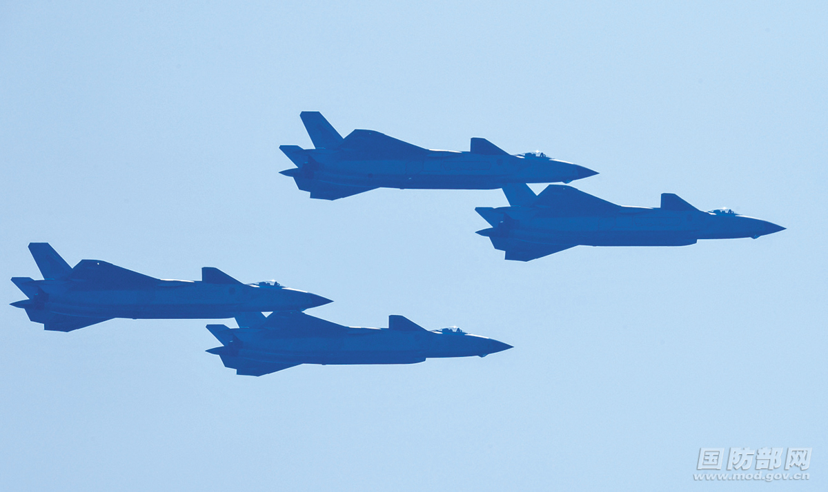 空軍殲-20戰(zhàn)機(jī)四機(jī)編隊(duì)飛行展示。