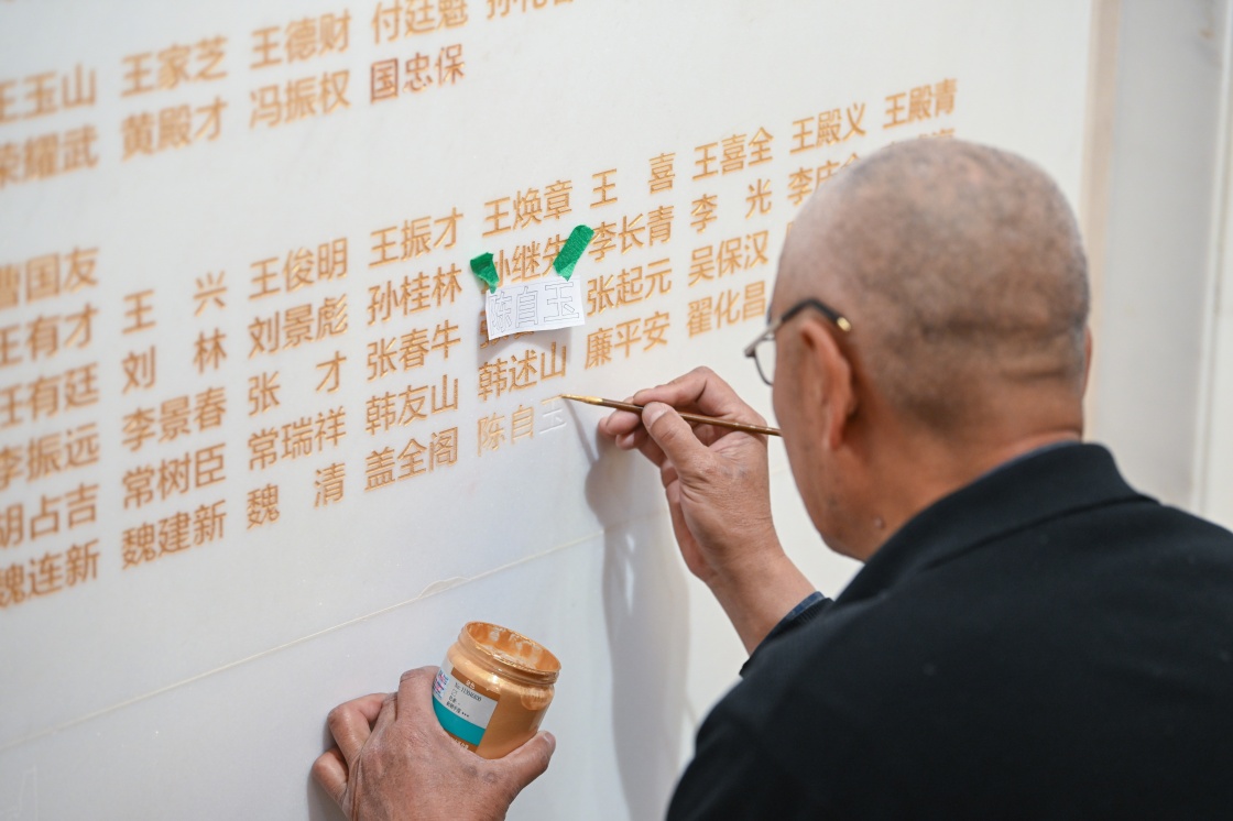 3月29日,在平津戰(zhàn)役紀(jì)念館,工作人員為新確認(rèn)的烈士刻名描金。