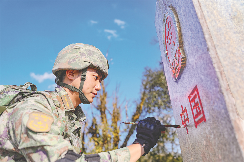 仲春時節(jié),陸軍某邊防連巡邏分隊官兵為界碑描紅。龍嘉樂 攝