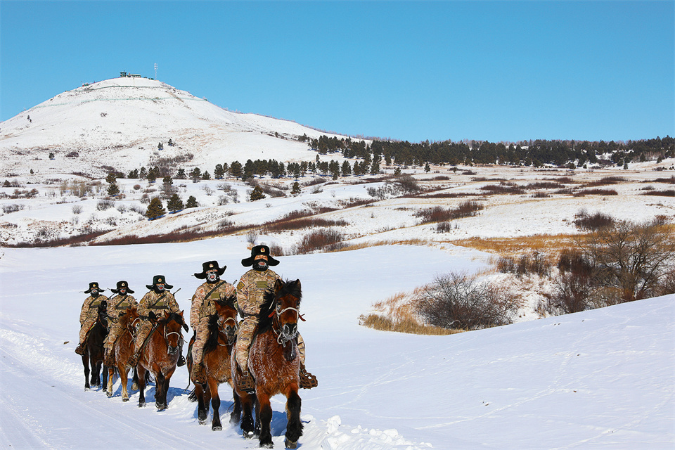巡邏隊伍行進在茫茫雪野中。龍喜濤 攝