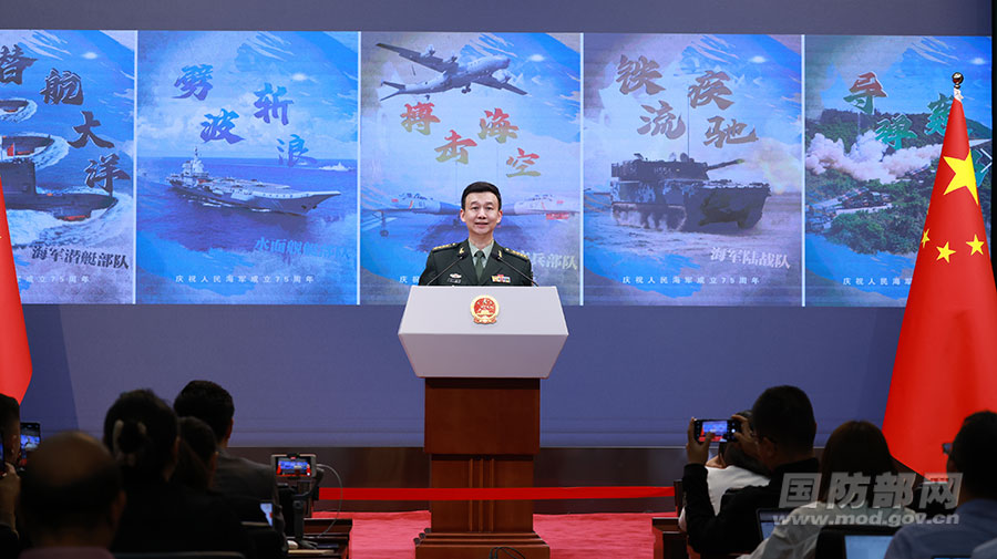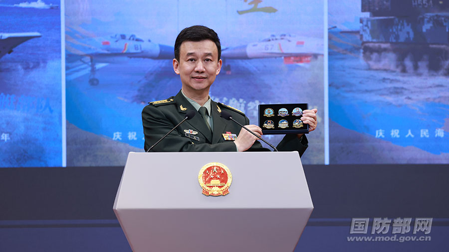 吳謙:如果沒有其他問題,我再說兩句。4月23日是人民海軍成立75周年紀(jì)念日,首先祝賀海軍生日快樂!祝愿人民海軍在黨的堅強領(lǐng)導(dǎo)下,劈波斬浪,向海圖強!再送個彩蛋。海軍的戰(zhàn)友委托我們給各位記者朋友贈送一個小紀(jì)念品——一套海軍徽章,分別是海軍錨、國產(chǎn)航母、兩棲攻擊艦、大型驅(qū)逐艦、艦載戰(zhàn)斗機、潛艇,希望大家喜歡。記者會結(jié)束后,請到工作人員處領(lǐng)取。