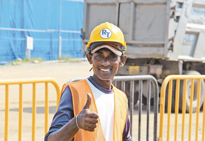 科倫坡港口城填海造地工程項目雇傭斯方員工超過1000人,高峰期能達到2500人左右。圖為當?shù)毓と素Q起大拇指贊揚這一工程。 苑基榮攝