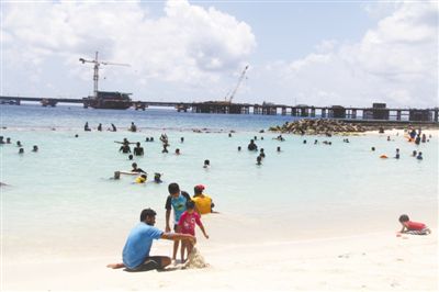 馬爾代夫海灘,人們游玩休憩。遠處為正在建設(shè)的中馬友誼大橋。(圖片來源:人民日報 鄒松攝)
