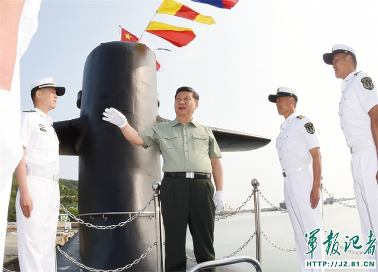 夏日的青島,紅瓦綠樹,碧海清風。15時30分許,習近平來到某潛艇部隊,首先聽取了部隊建設有關情況介紹。軍港碼頭上,前不久參加過南海海域海上閱兵的某新型潛艇伏波靜臥,滿旗高懸,艇員們在艇面上分區(qū)列隊,精神抖擻迎接習近平到來。習近平登上潛艇,走到艇員們中間。習近平一直牽掛著常年奮斗在深海大洋的潛艇兵們,他關切詢問官兵的工作生活情況。了解到官兵們愛崗敬業(yè)、戰(zhàn)風斗浪,圓滿完成各項工作時,習近平點頭贊許。習近平下艙室、進戰(zhàn)位,詳細了解武器彈藥技戰(zhàn)術性能。他勉勵官兵們堅定理想信念,建設堅強集體,把打贏本領搞過硬。習近平在潛艇航泊日志上鄭重簽名。離開碼頭時,習近平特意走向停泊在附近的另一艘潛艇,向整齊站坡的官兵們揮手致意。