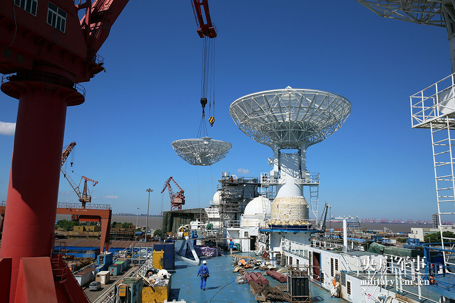 遠(yuǎn)望5號(hào)船首次中修技術(shù)改造現(xiàn)場(chǎng)——天線吊裝。安善福攝
