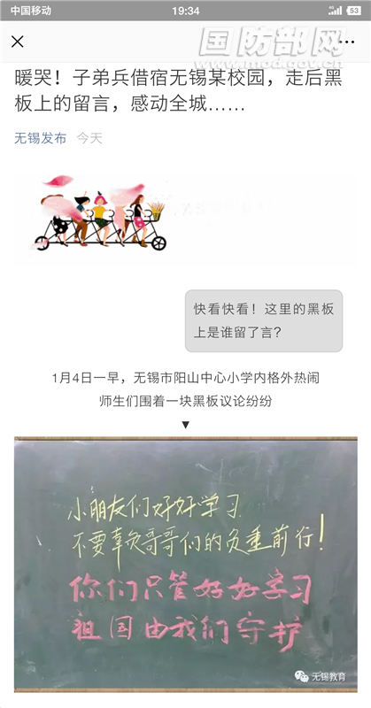 1月5日,江蘇省無(wú)錫市官方微信“無(wú)錫發(fā)布”的一條名為《暖哭!子弟兵借宿無(wú)錫某校園,走后黑板上的留言,感動(dòng)全城……》的新聞刷爆朋友圈,瞬間點(diǎn)擊量過(guò)萬(wàn)。廣大市民在感受暖暖正能量的同時(shí),也在尋找感動(dòng)全城的“主角”。