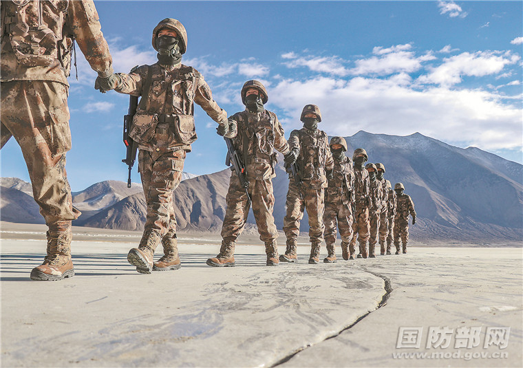 近日,因連續(xù)降雪,西藏阿里地區(qū)氣溫已降至零下28攝氏度。1月4日,阿里軍分區(qū)某邊防連巡邏分隊(duì),按計(jì)劃對海拔4300多米的某執(zhí)勤點(diǎn)進(jìn)行巡邏。圖為巡邏分隊(duì)官兵手拉手通過冰面向點(diǎn)位前行。劉曉東攝