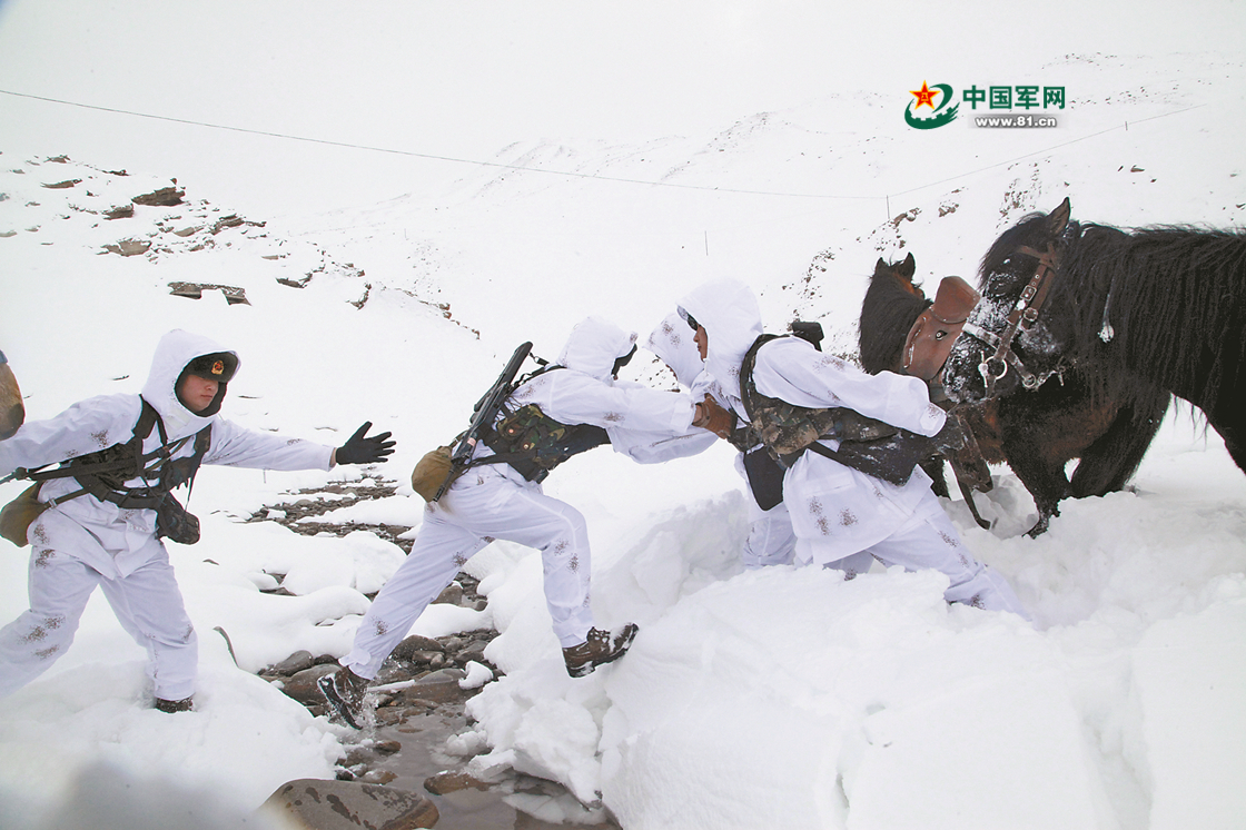 2月5日,素有“雪海孤島”之稱的新疆克孜勒蘇軍分區(qū)玉其塔什邊防連官兵,冒著嚴寒對5號山口實施巡邏執(zhí)勤。圖為官兵在巡邏途中。劉慎 攝