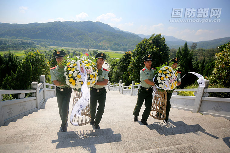 武警官兵向革命先烈敬獻(xiàn)花籃。