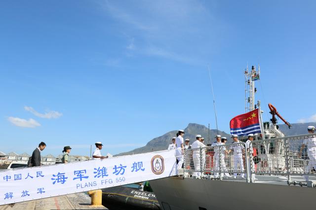 解放軍報南非開普敦11月24日電??特約記者李唐、王冠彪報道:當地時間11月24日下午,參加中國、俄羅斯、南非三國海上聯(lián)合演習的中國海軍濰坊艦抵達南非開普敦港,南非海軍在碼頭舉行了隆重的歡迎儀式。