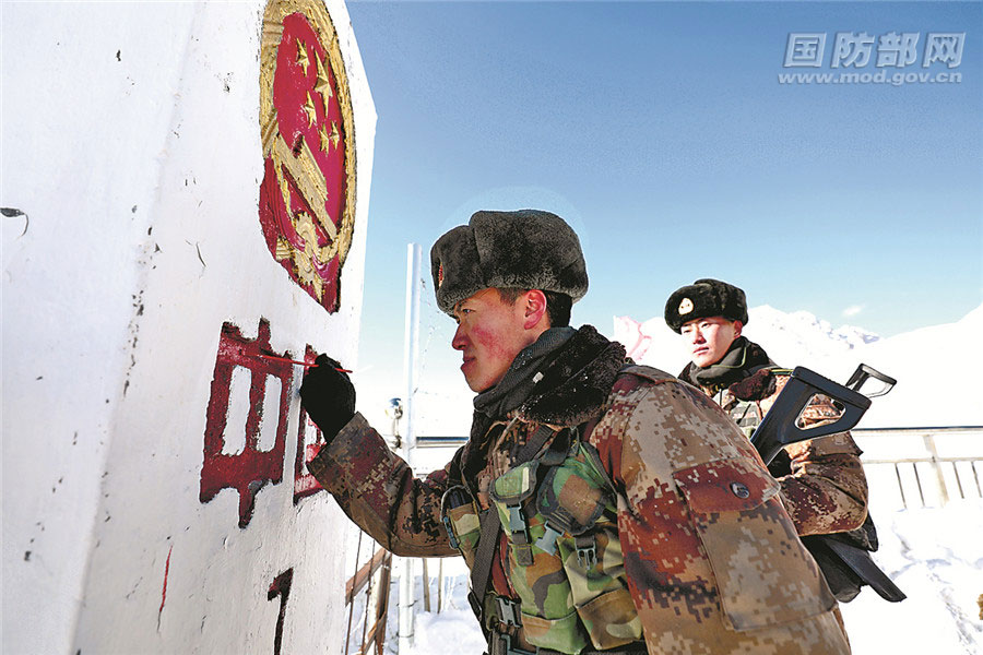 下午3時(shí)30分,巡邏隊(duì)終于到達(dá)7號(hào)界碑?!坝H愛的界碑,我又來(lái)了,讓我最后一次為你描紅吧!”寒風(fēng)中,戍邊已經(jīng)12載的裴濤,用顫抖的手在界碑上描寫著“中國(guó)”二字,淚水不知不覺滑落。